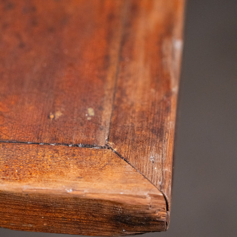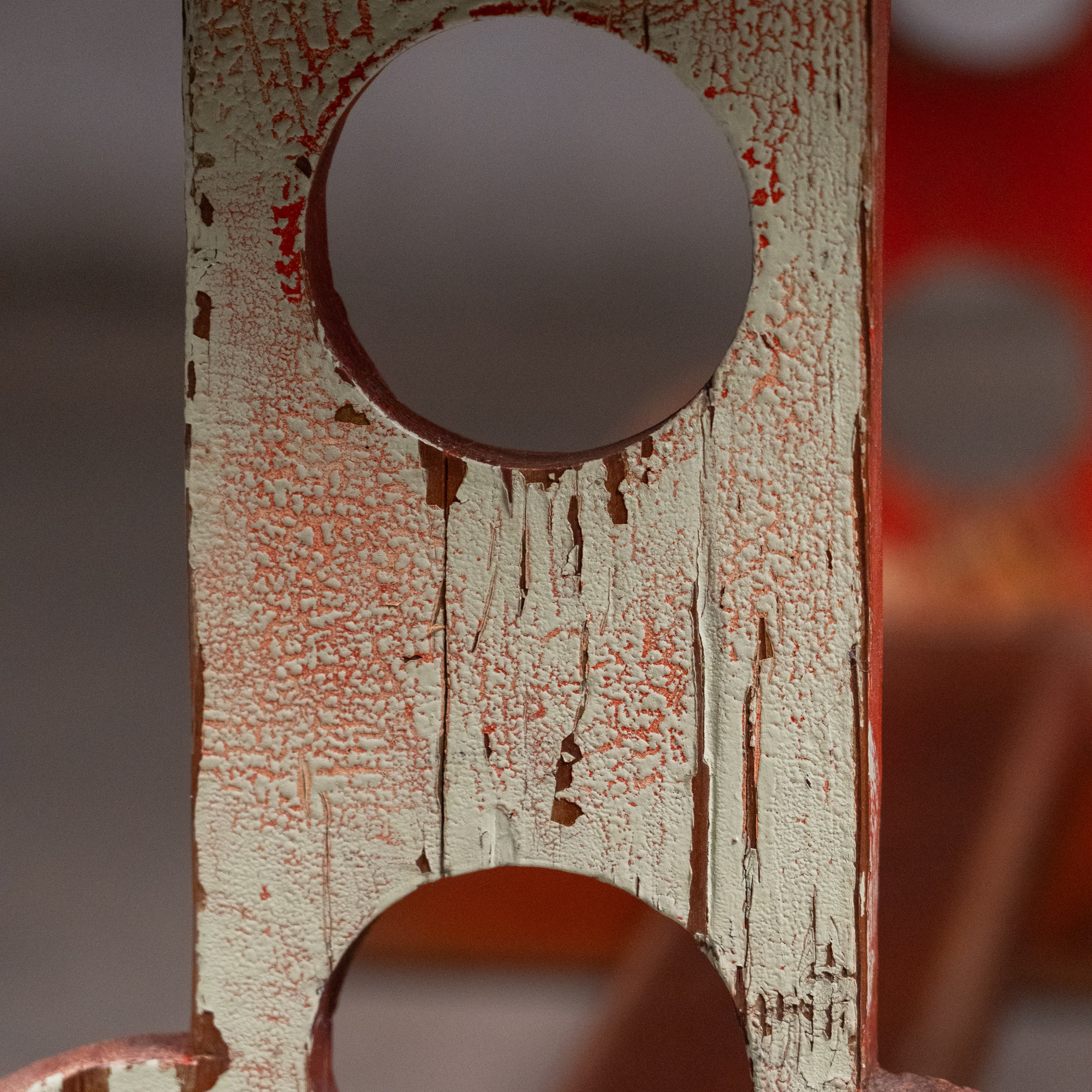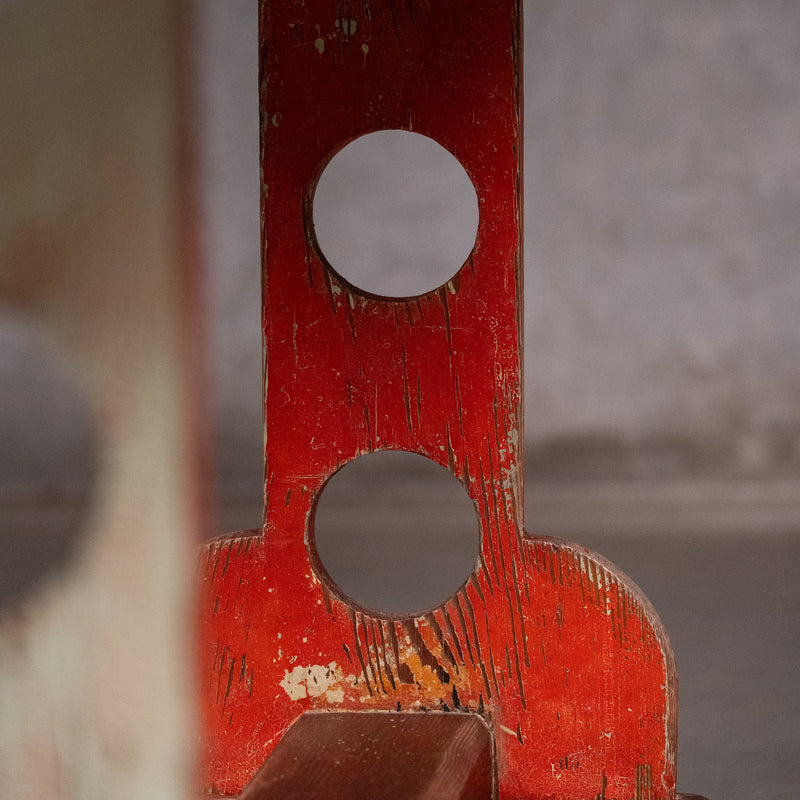 The base retains layered historic paint, with traces of original red beneath a later cream overpaint, creating rich texture and depth. The stretcher construction and hand-shaped profiles reinforce its rural farmhouse origin