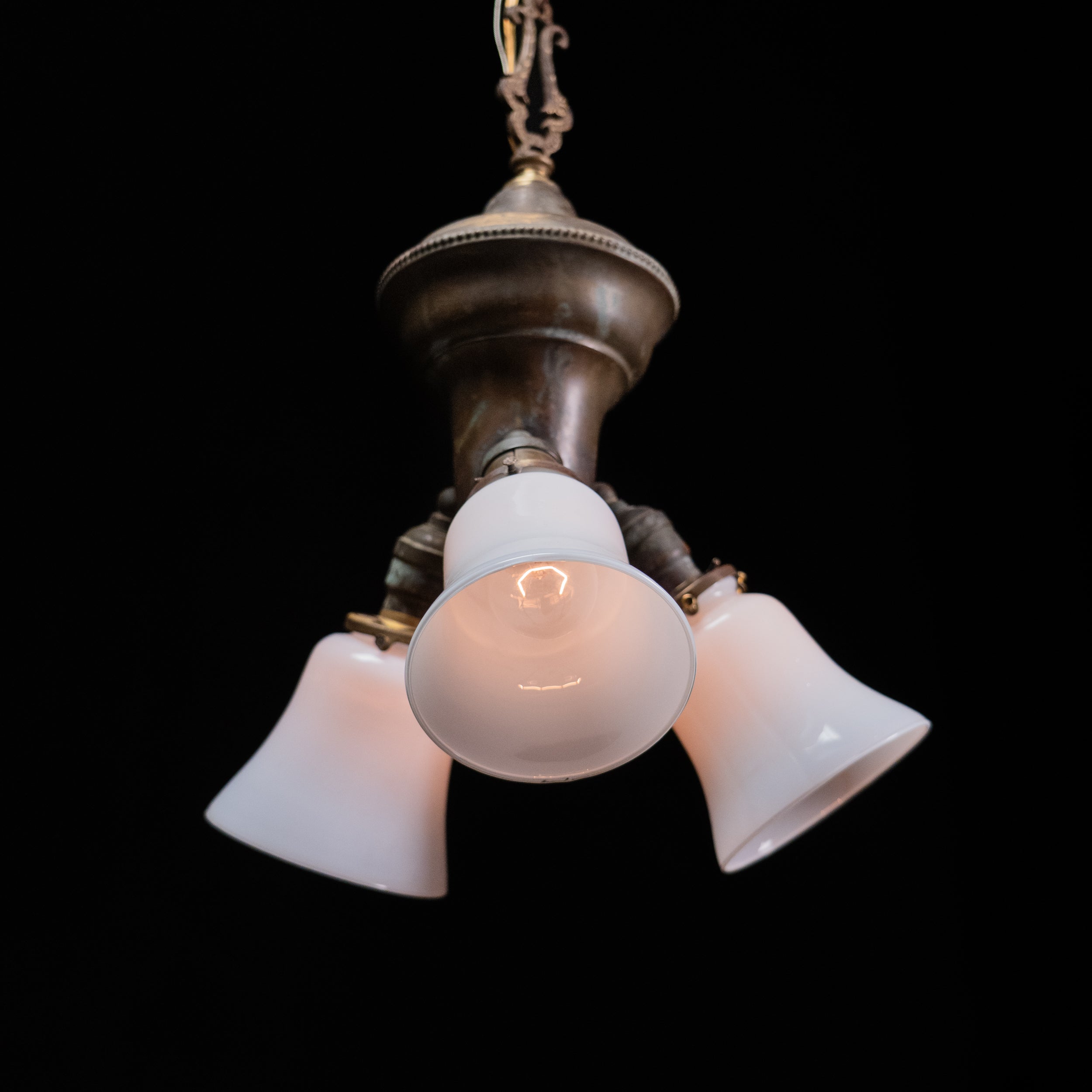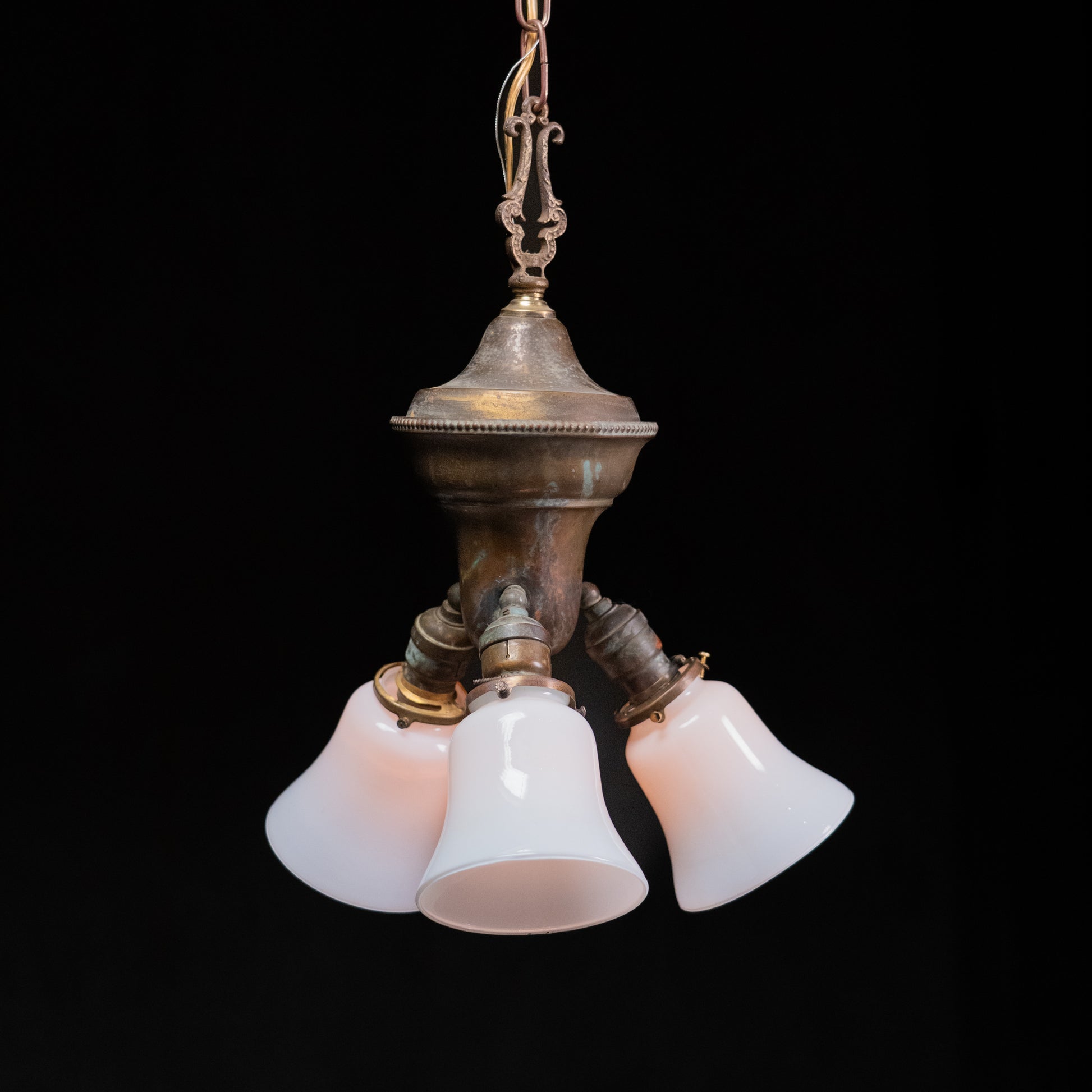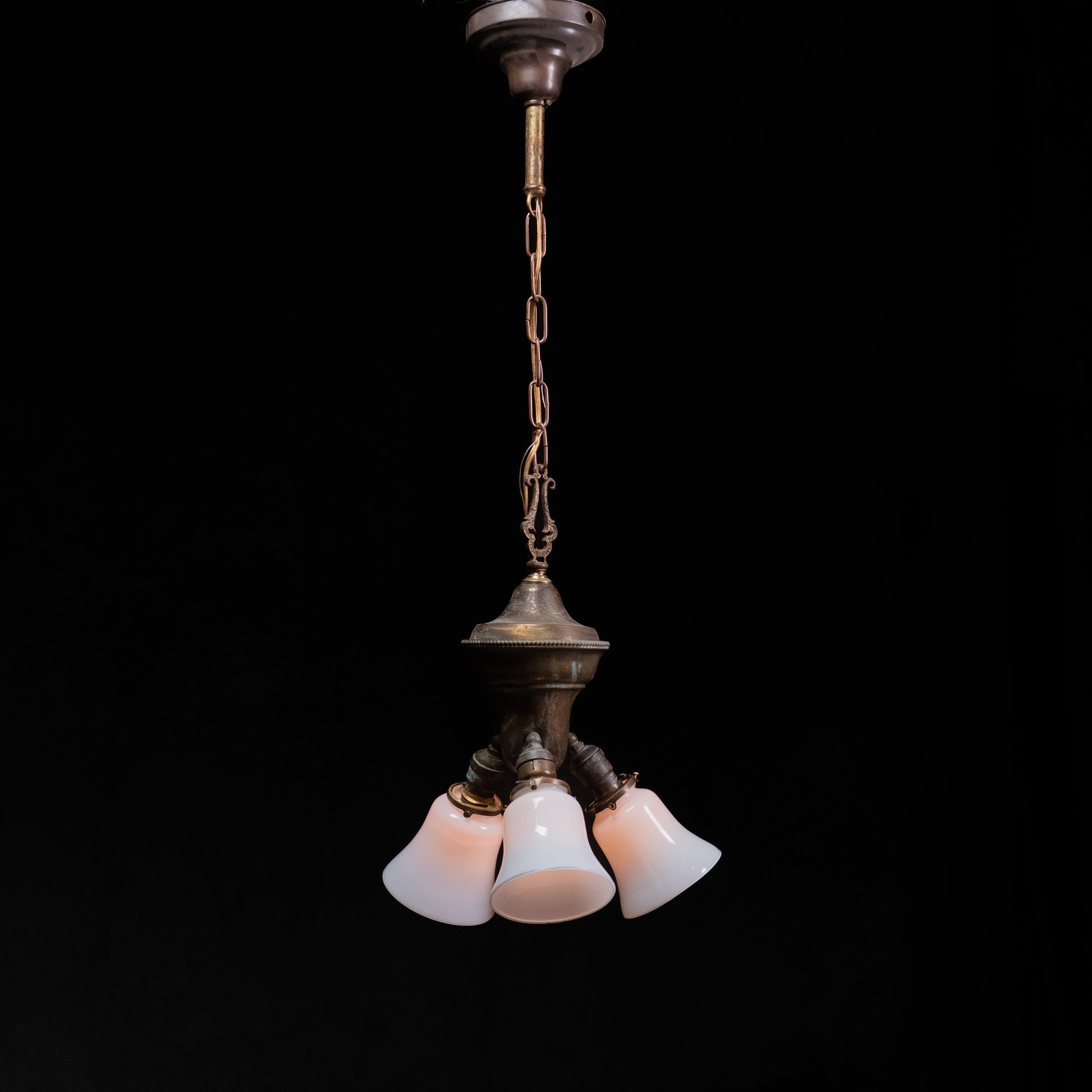 Early American Electric Three-Light cluster Chandelier pendant with Opaline Glass Shades, c. 1920