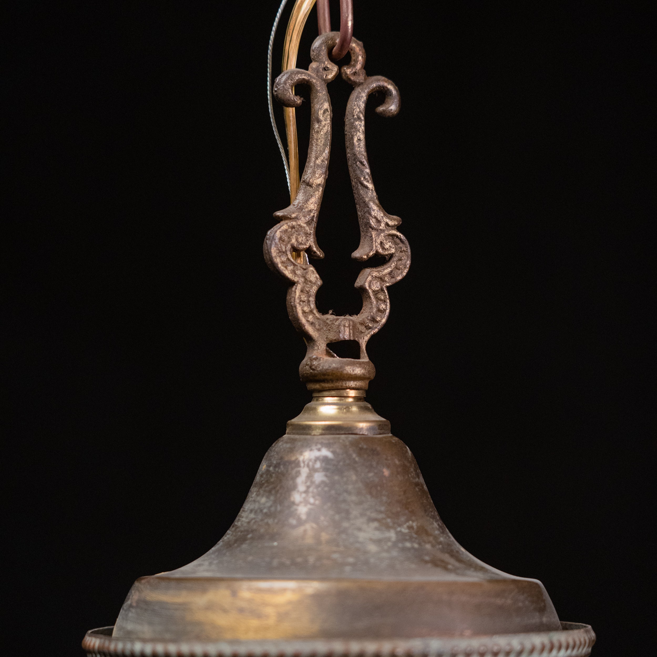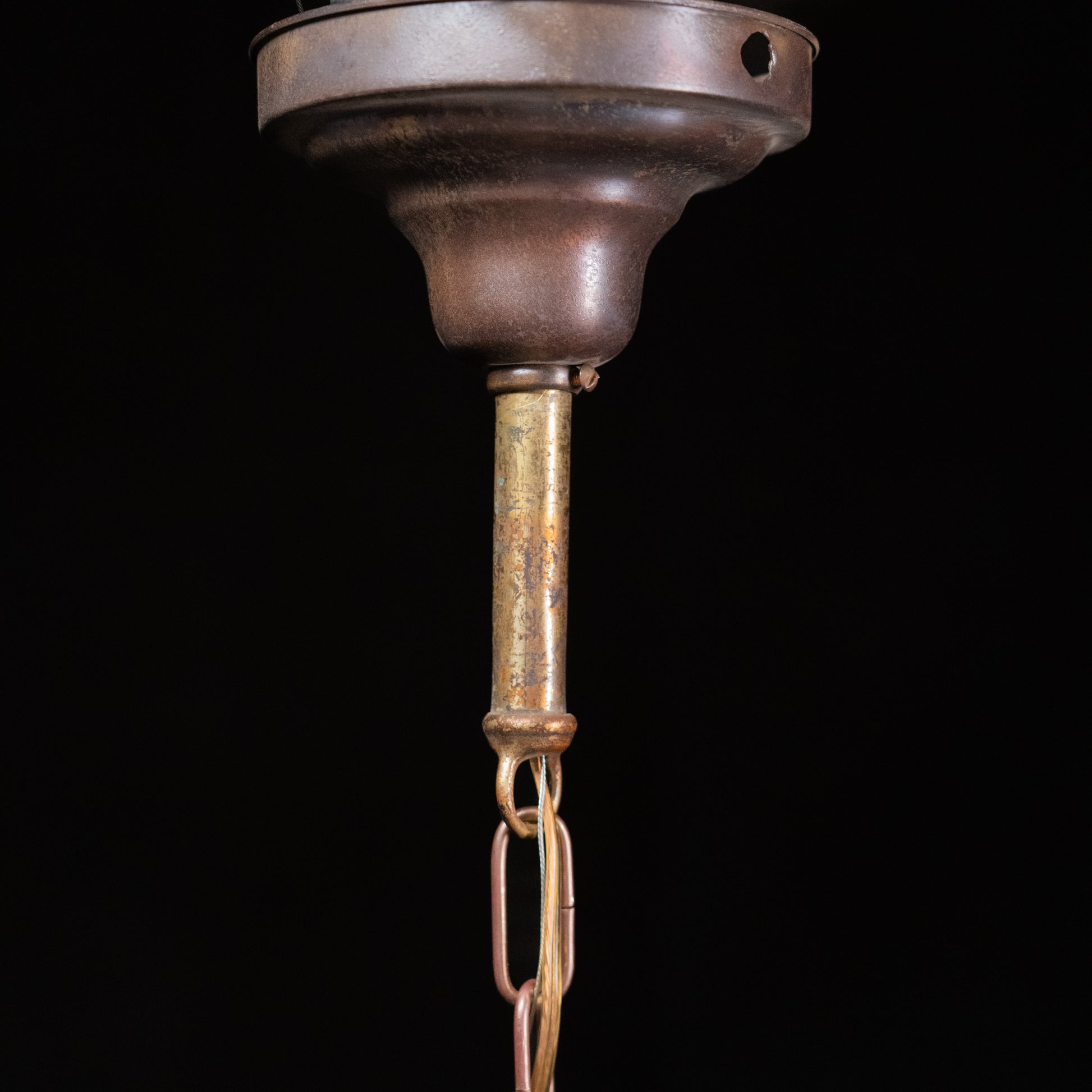 This early 20th-century American electric chandelier dates to circa 1915–1930 and reflects the transitional period when electric lighting had fully replaced gas, yet fixtures still retained traditional, hand-crafted forms.