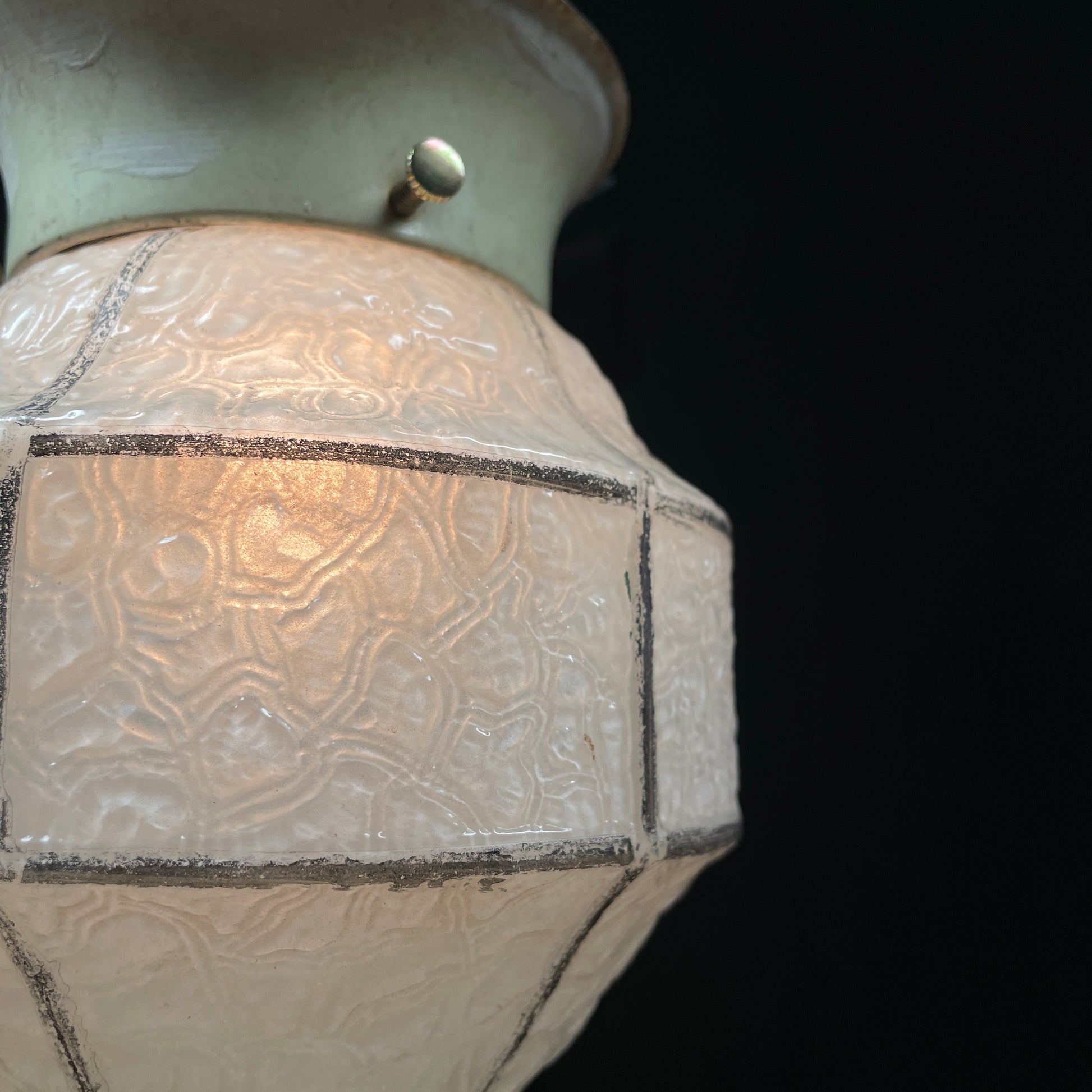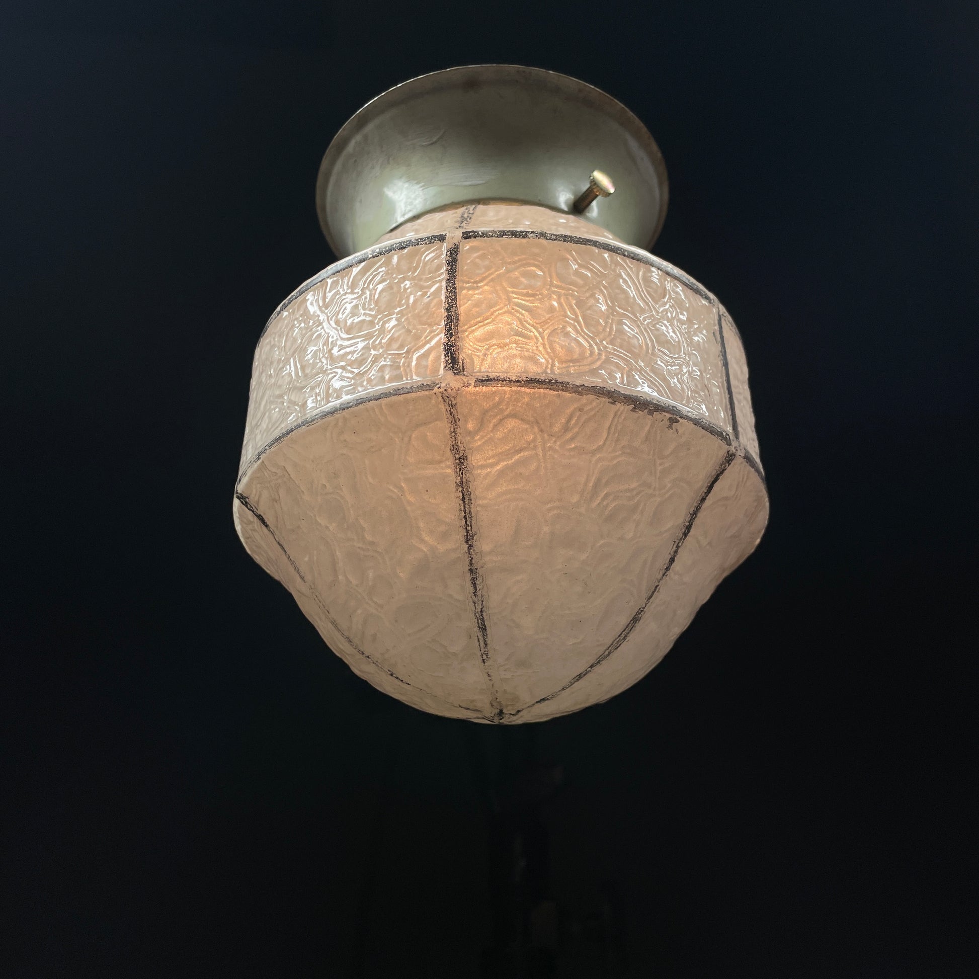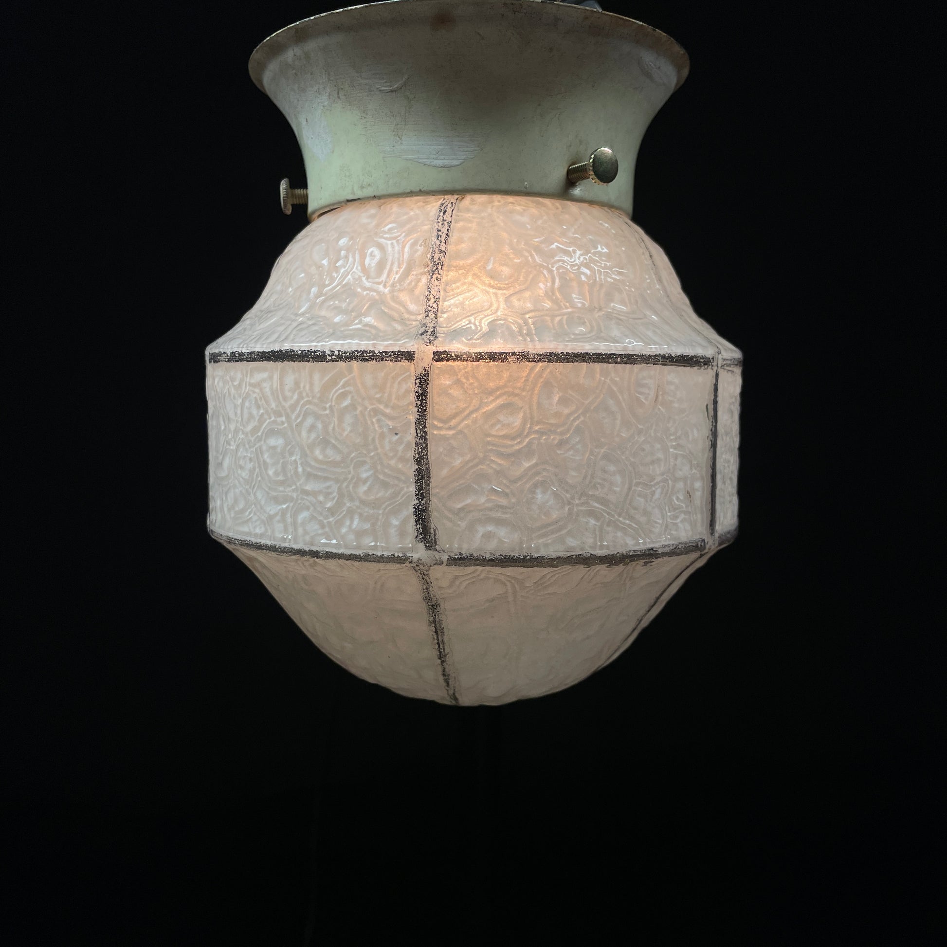 This flush mount features a very unique glass shade with a solid brass fitter with original white paint finish.