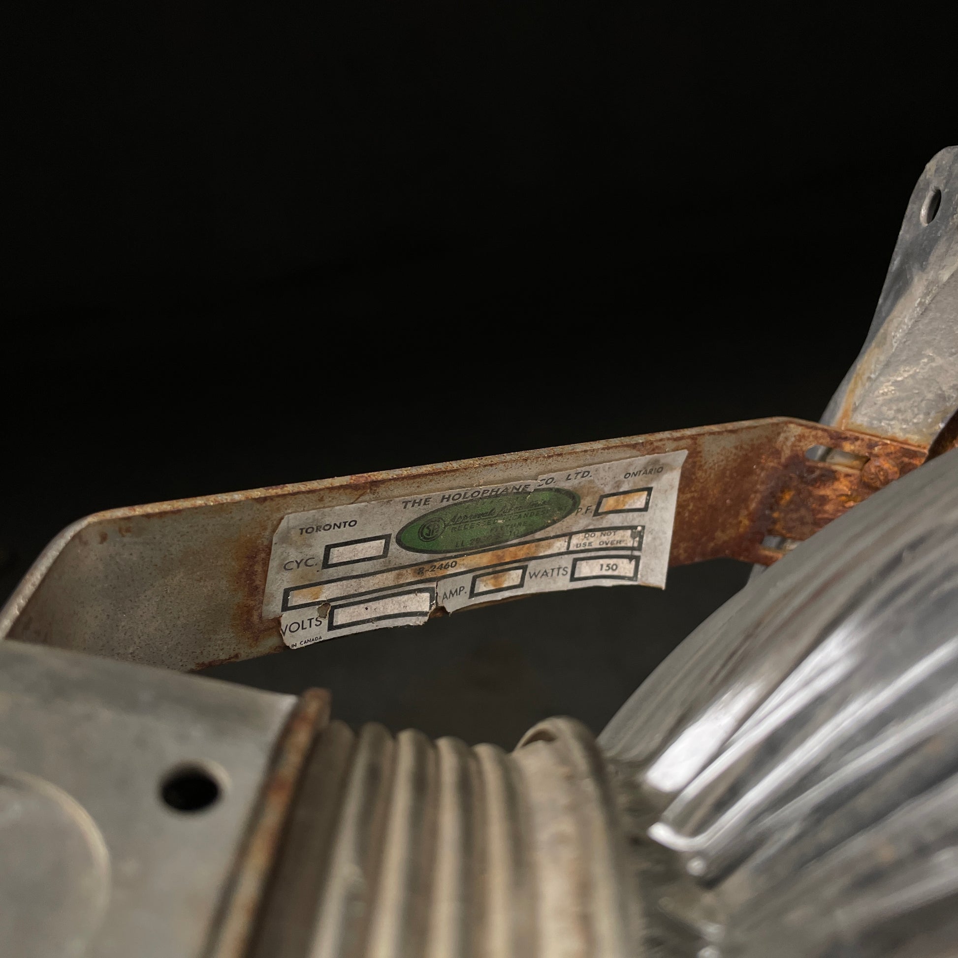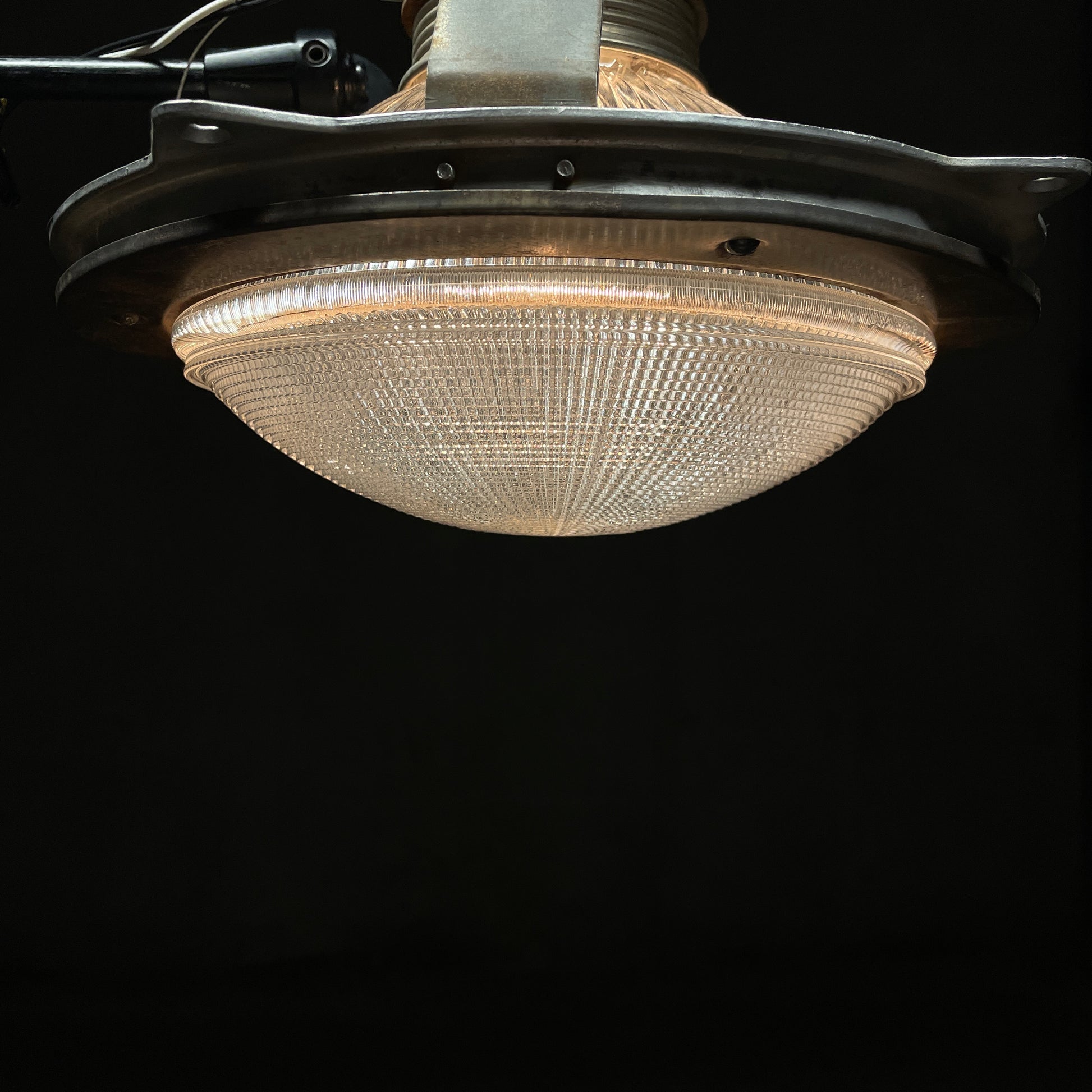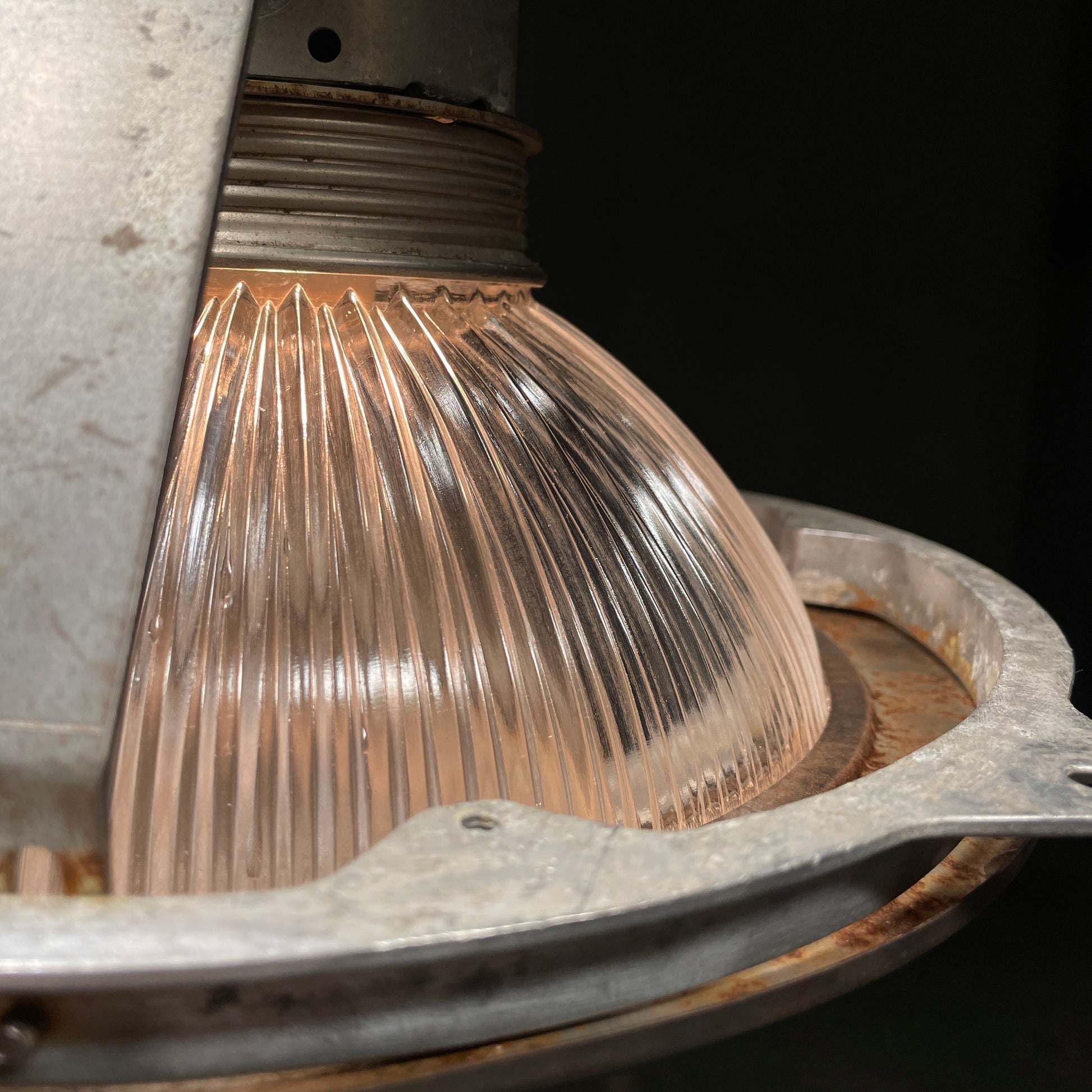 These unique examples of first style pot lights using prismatic holophane glass are easily mounted into a ceiling just like a pot light. Mist of the fixture stays in the ceiling with a small portion of the glass shade sticking out of ceiling ..real interesting fixture.