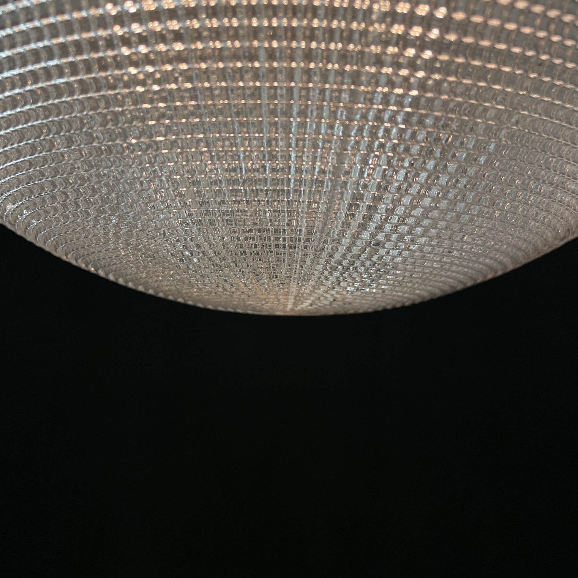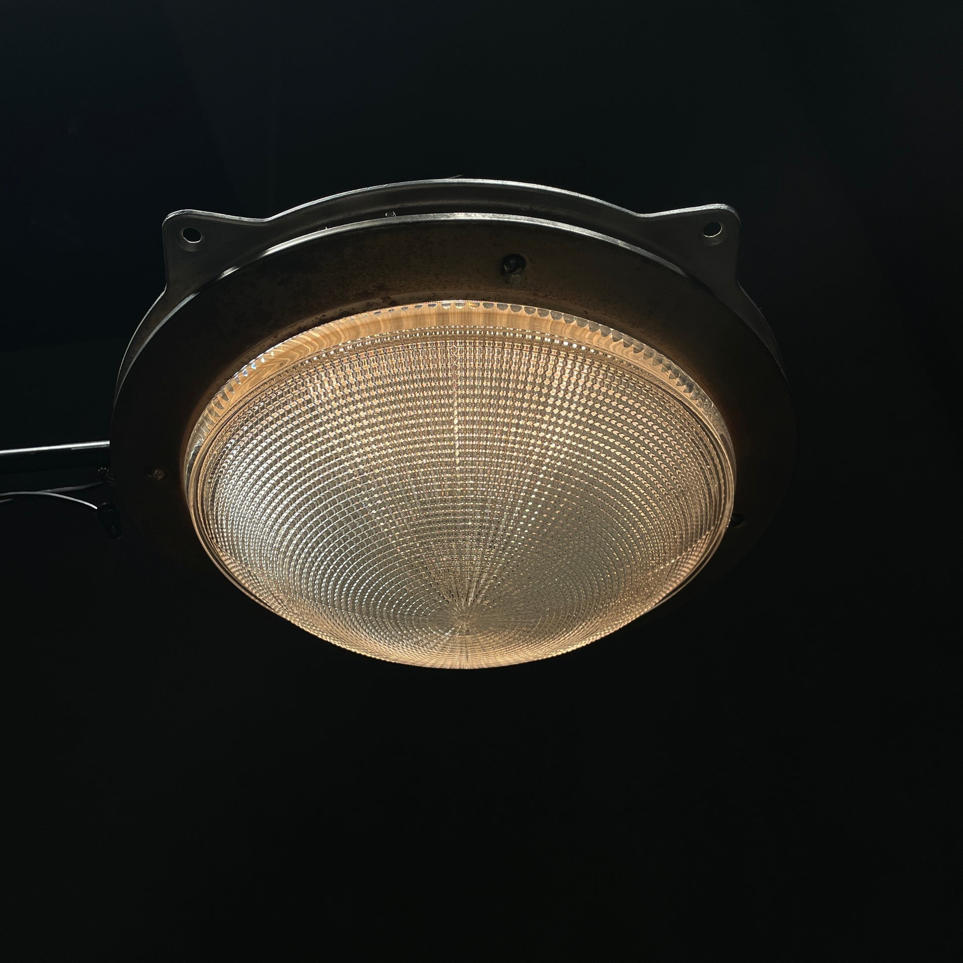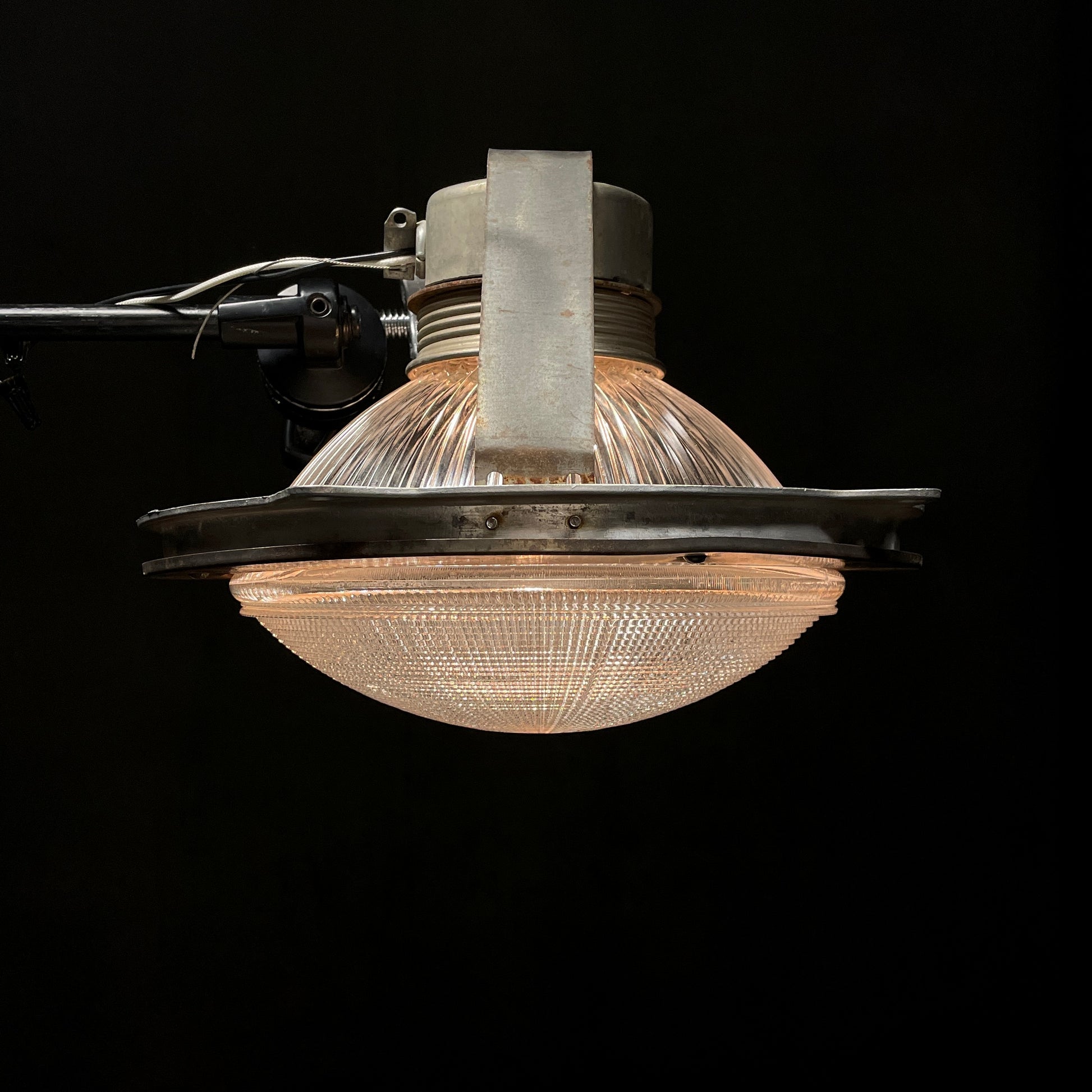 These unique examples of first style pot lights using prismatic holophane glass are easily mounted into a ceiling just like a pot light. Mist of the fixture stays in the ceiling with a small portion of the glass shade sticking out of ceiling ..real interesting fixture.