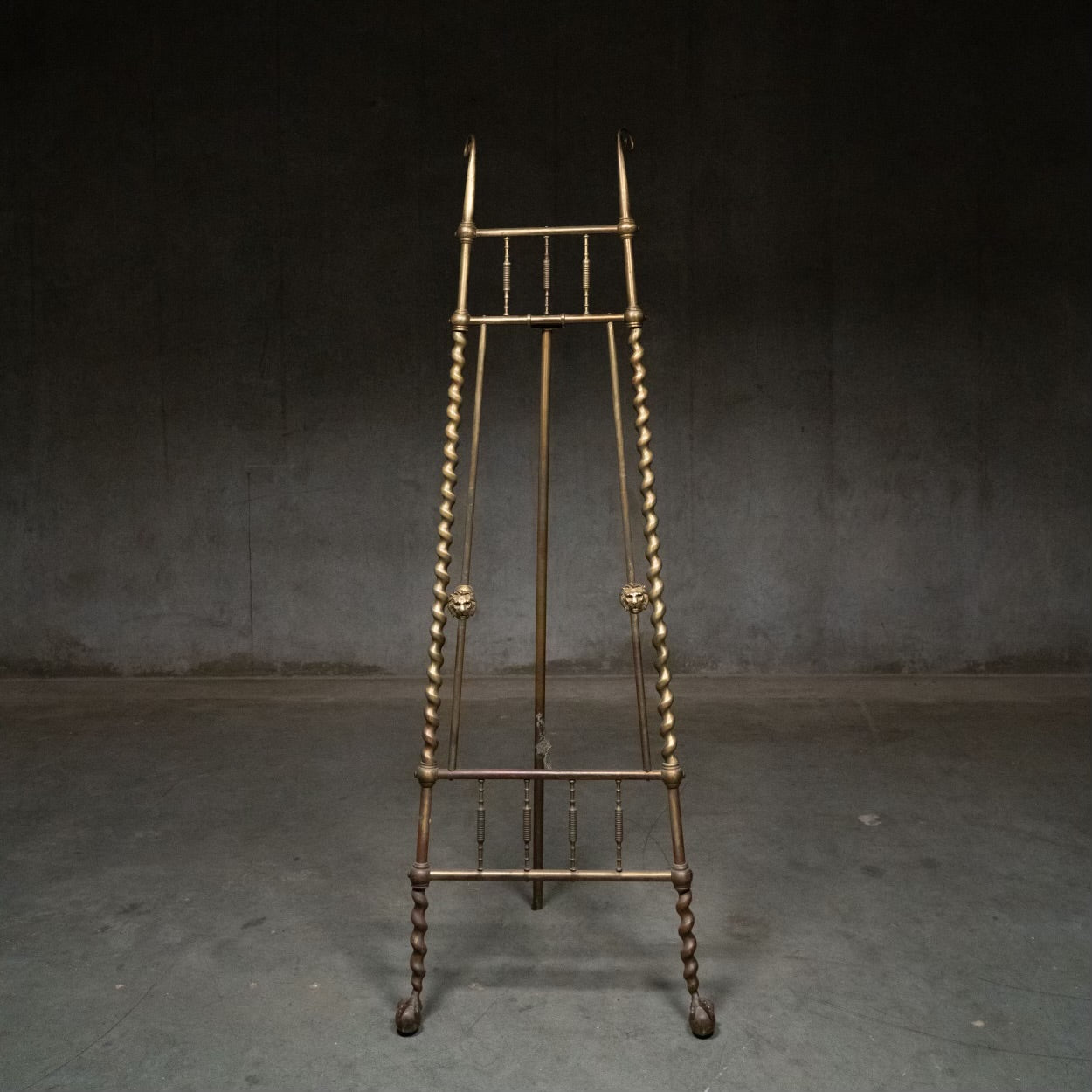 A decorative well made brass easel showing perfect patina and nice cast details. Ball and claw foot with lion face holders . Most likely made in ENGLAND.