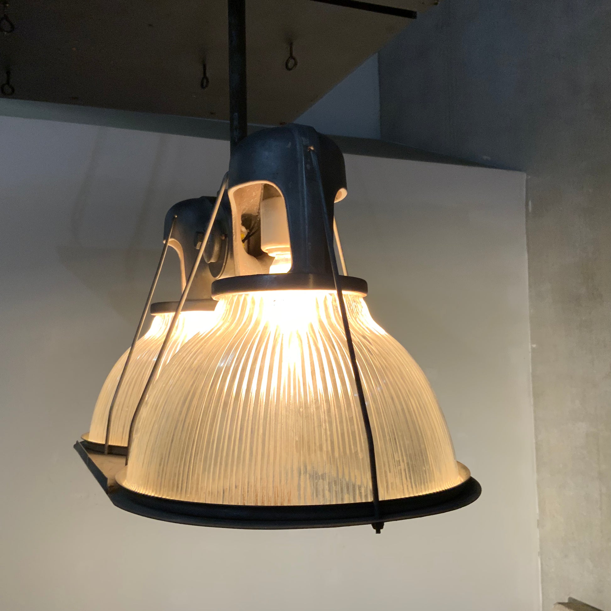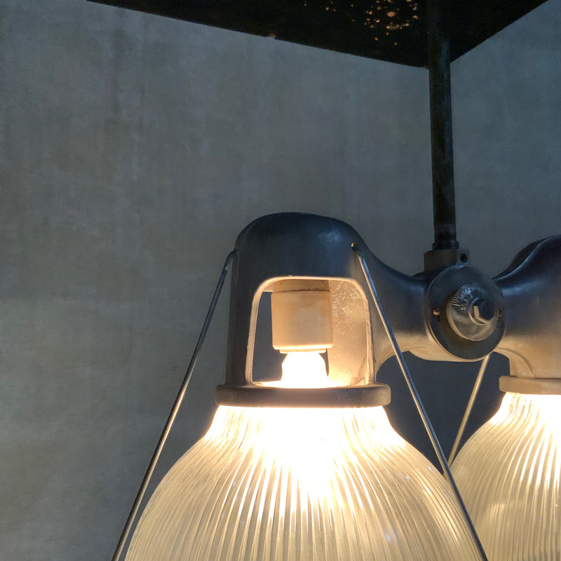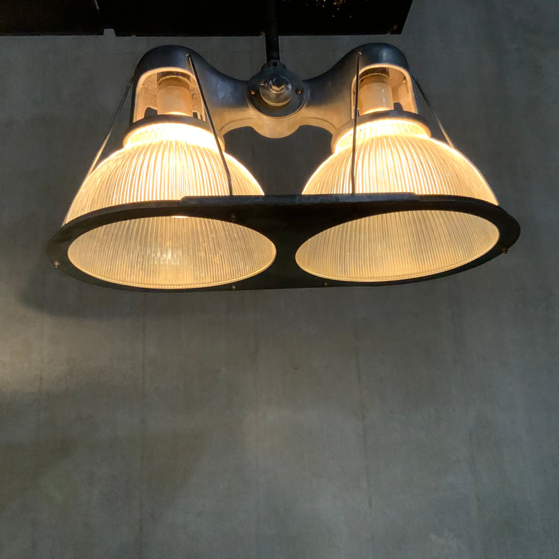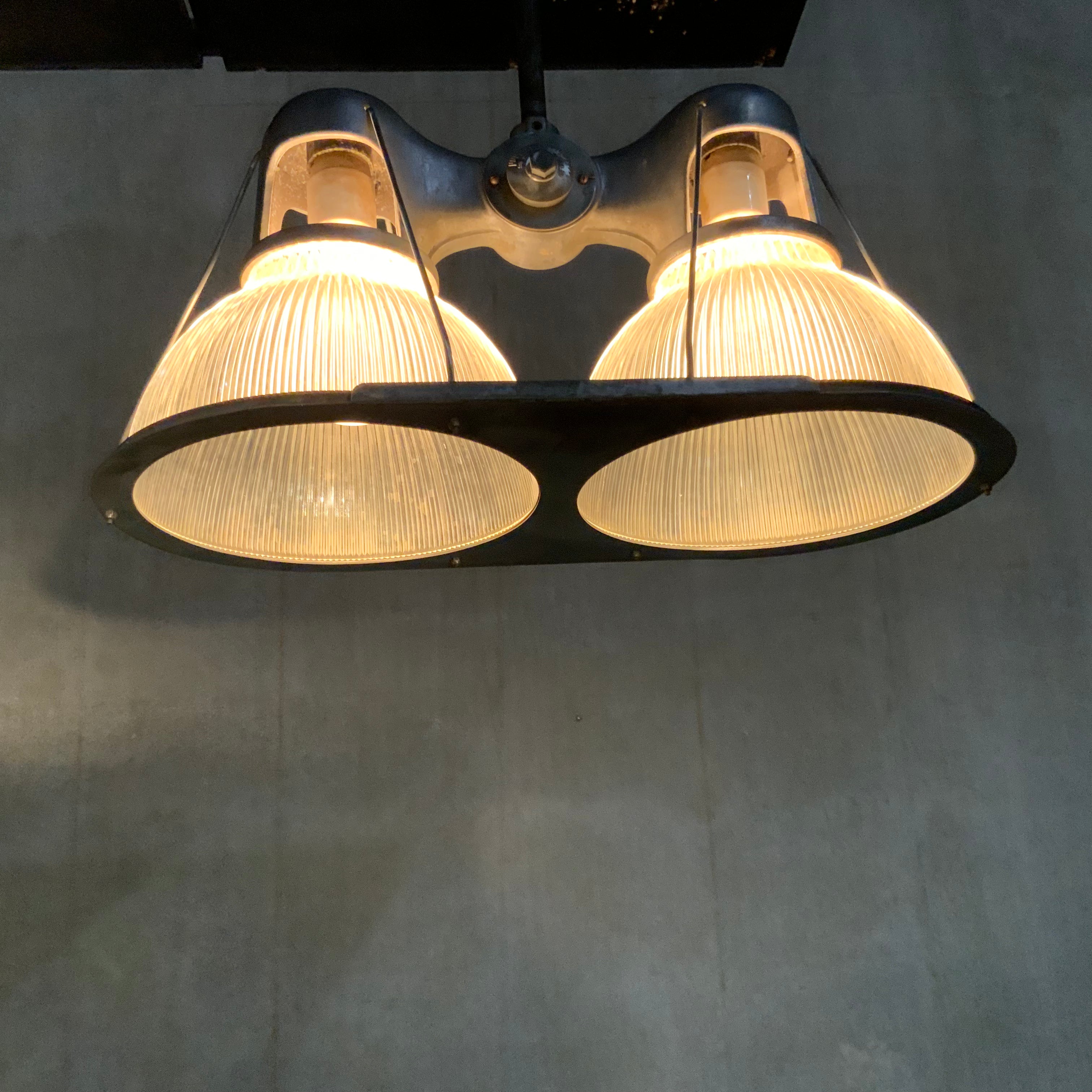 C 1950’s Industrial Double Holophane glass pendant fixture with metal frame. Includes Holophane stamps on frame. This is a rare form and is ideal for a work station or kitchen island. Holophane glass was invented in the 1890s and was made in many shapes, sizes and patterns to provide specific types of illumination. The term "Prismatic" is an alternative term for Holophane glass. Holophane glass is a beautiful choice for industrial lighting.