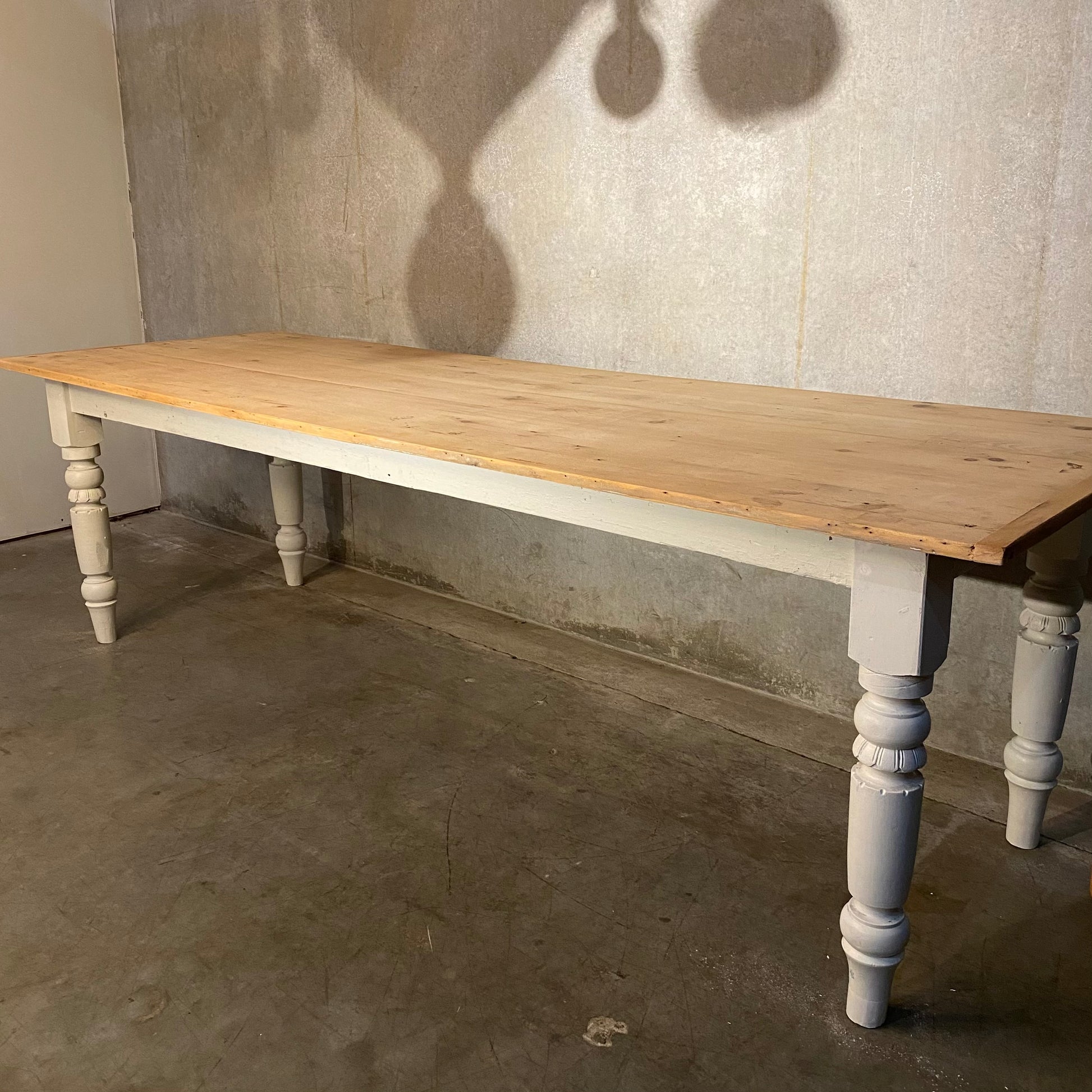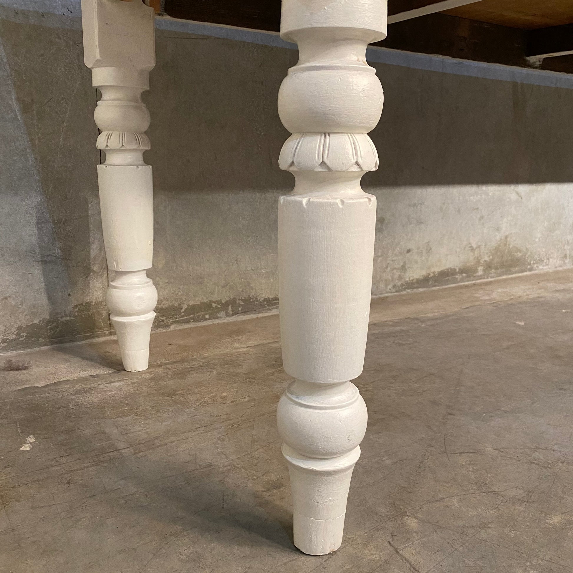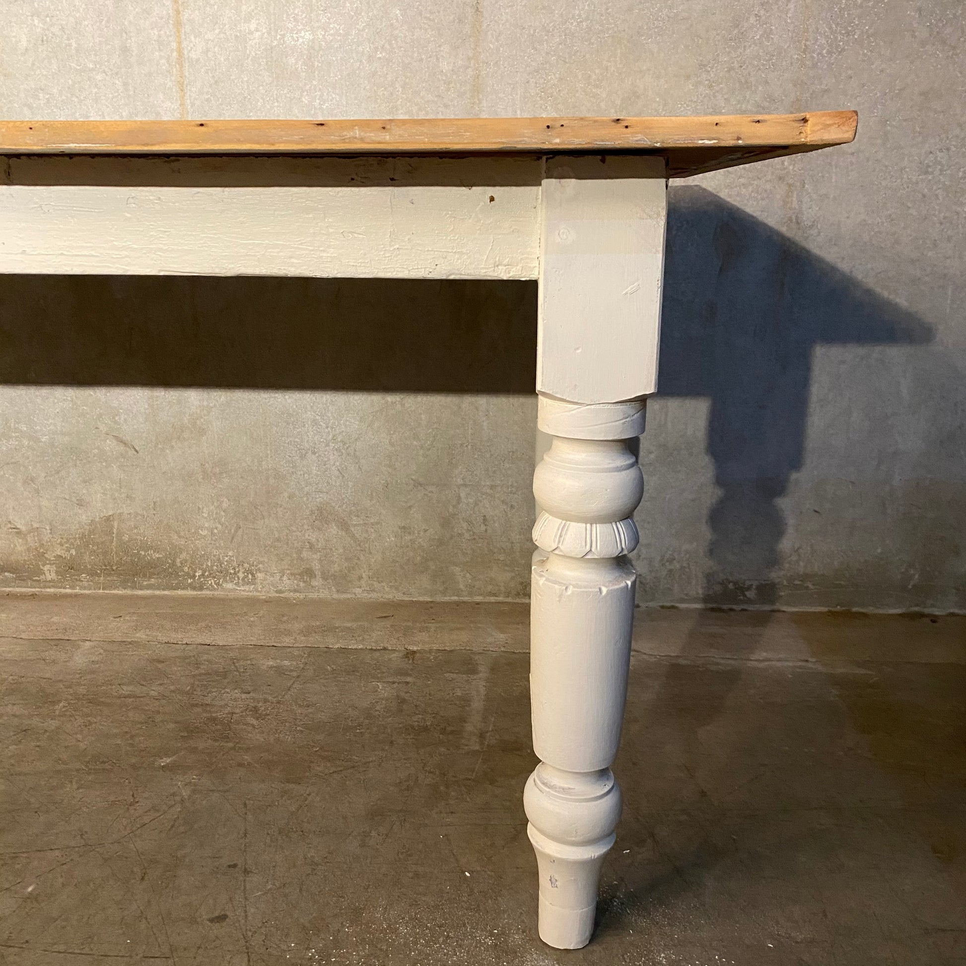 A convent table found in Montreal with a clean pine top , custom turned legs with multiple layers of white paint on the base .