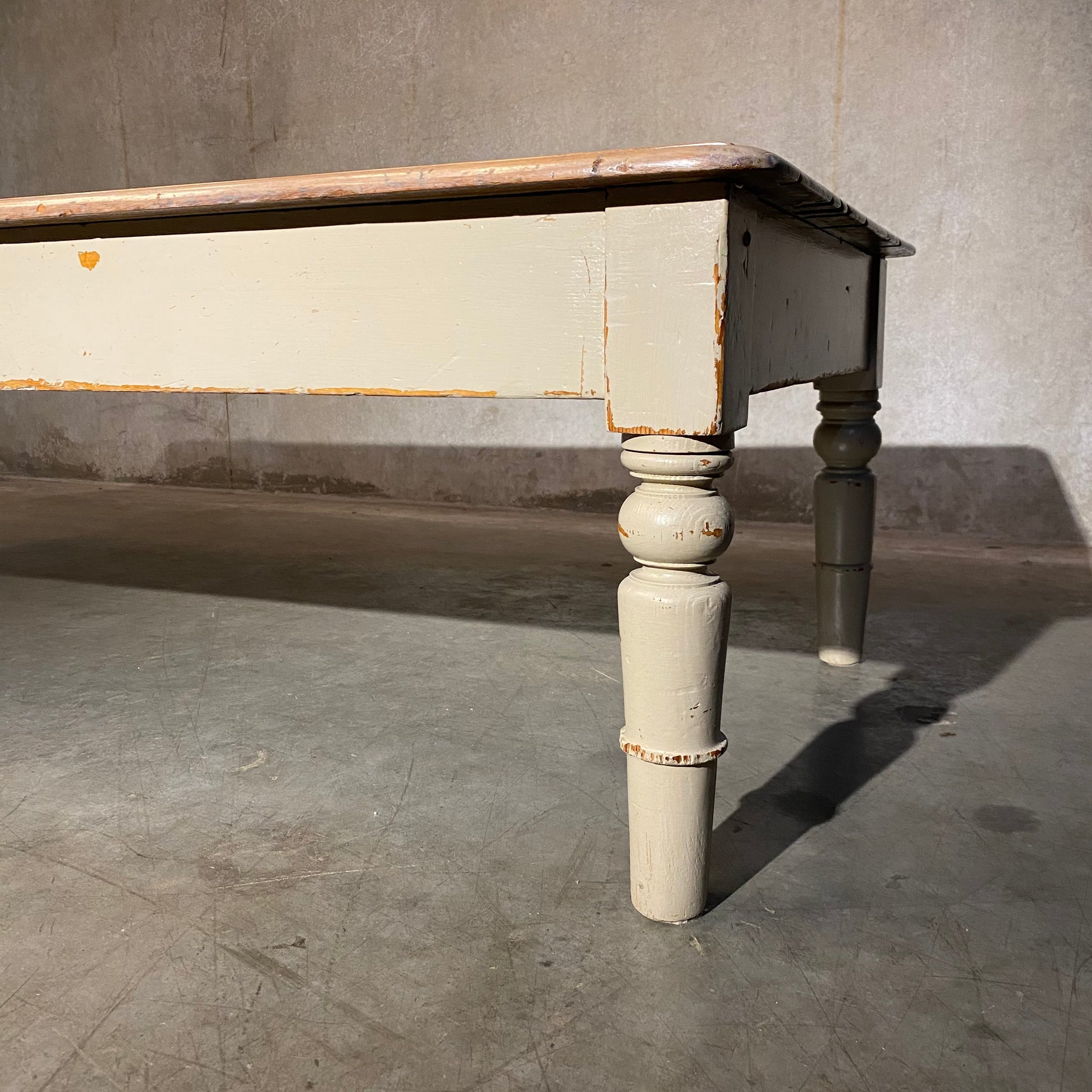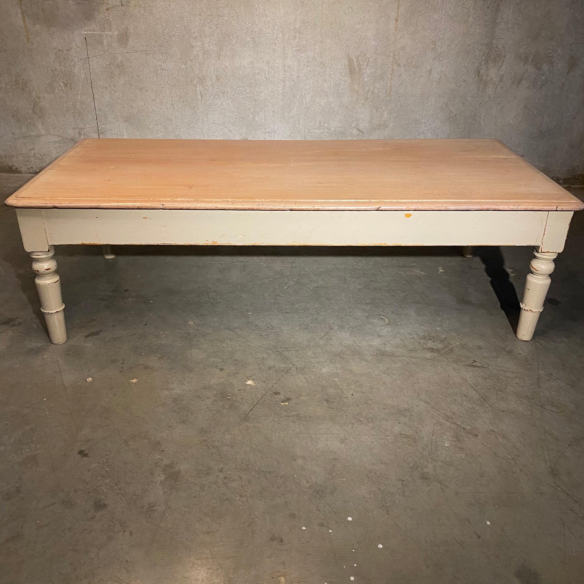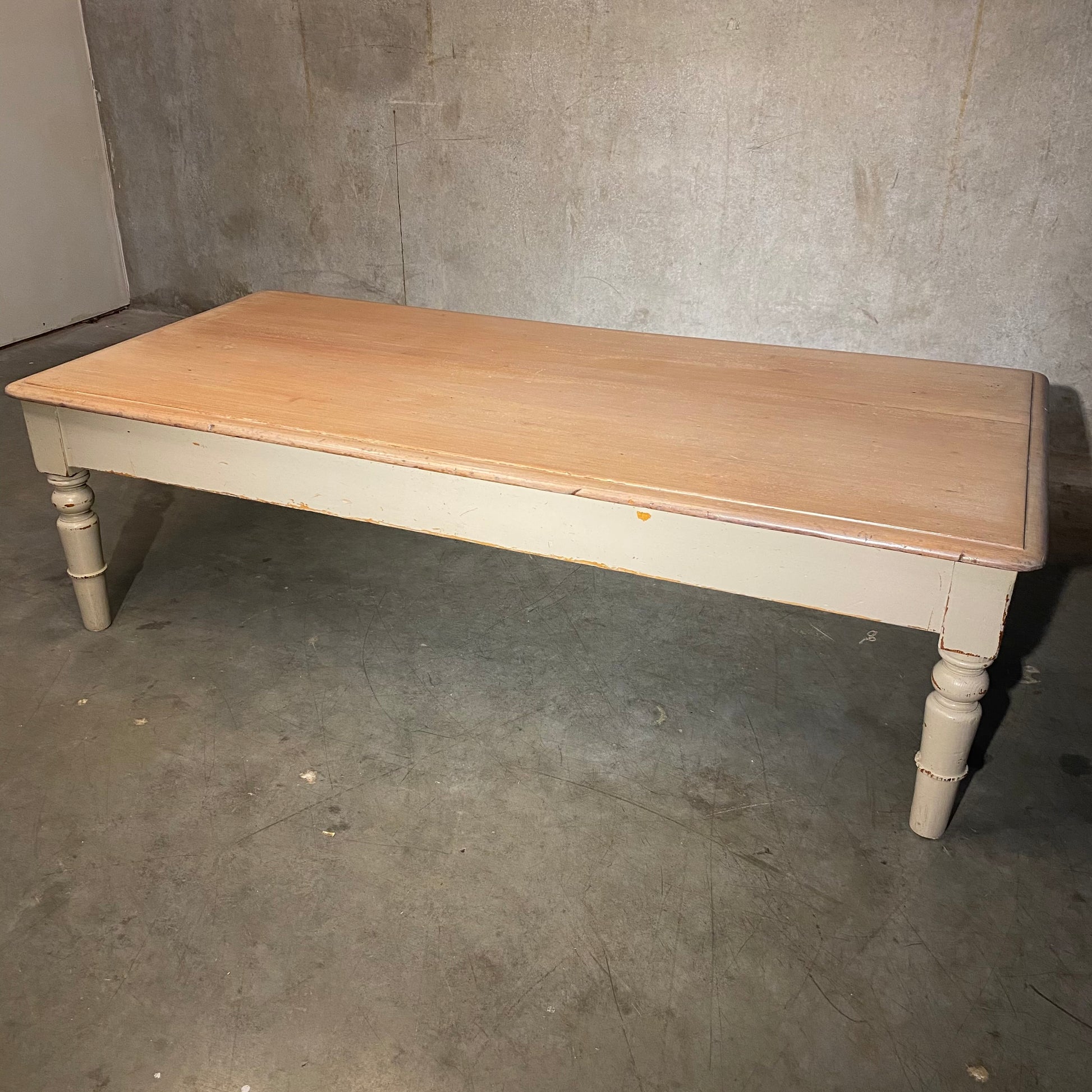 A very nice & simple style country table cut down years ago to accommodate a coffee table scenario. This example is original to the base with a bevelled edge and nice clean planks.