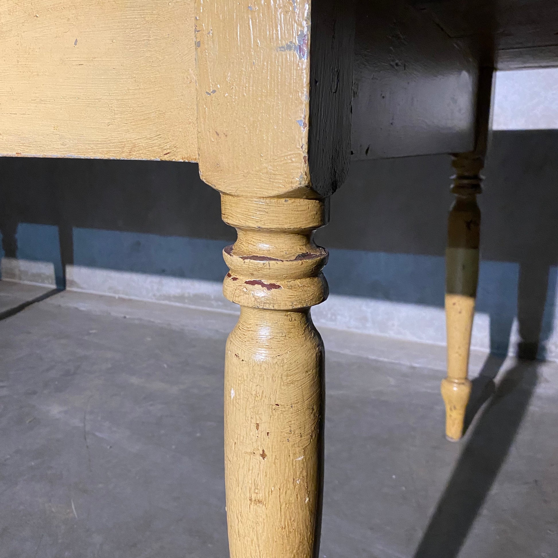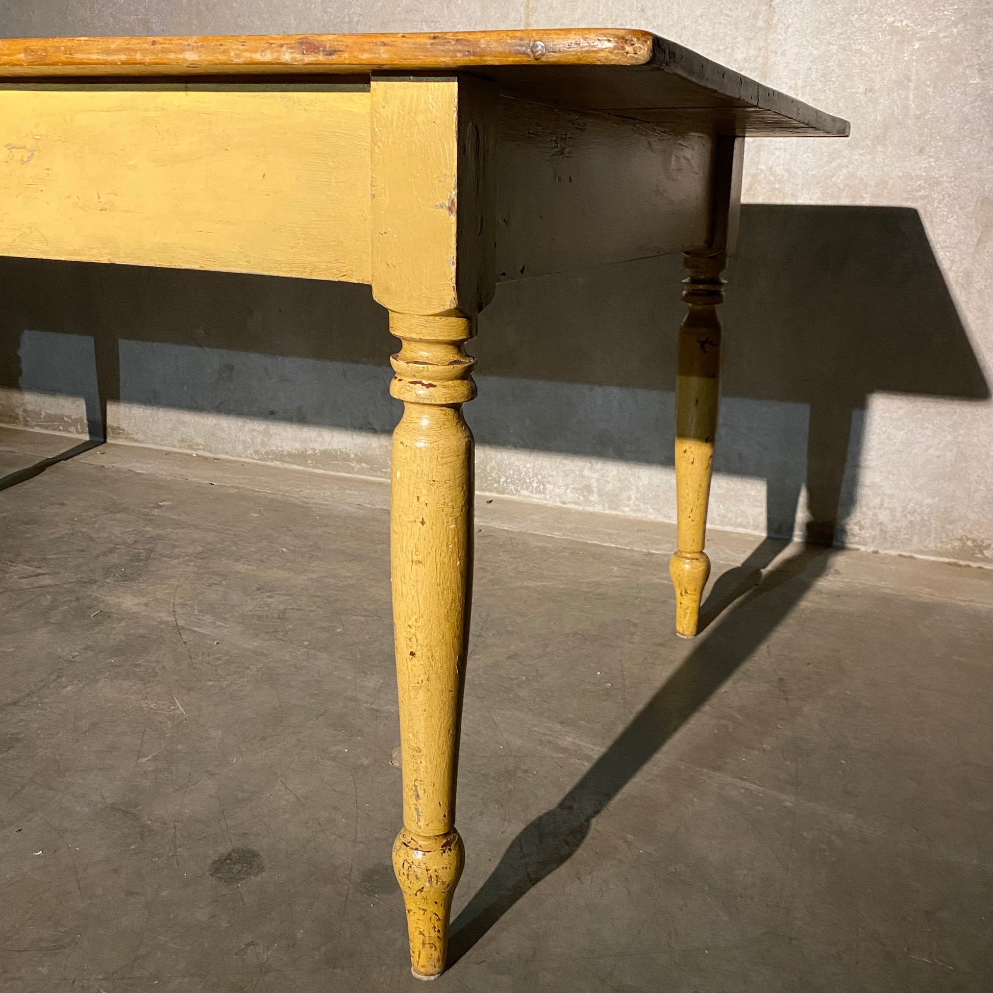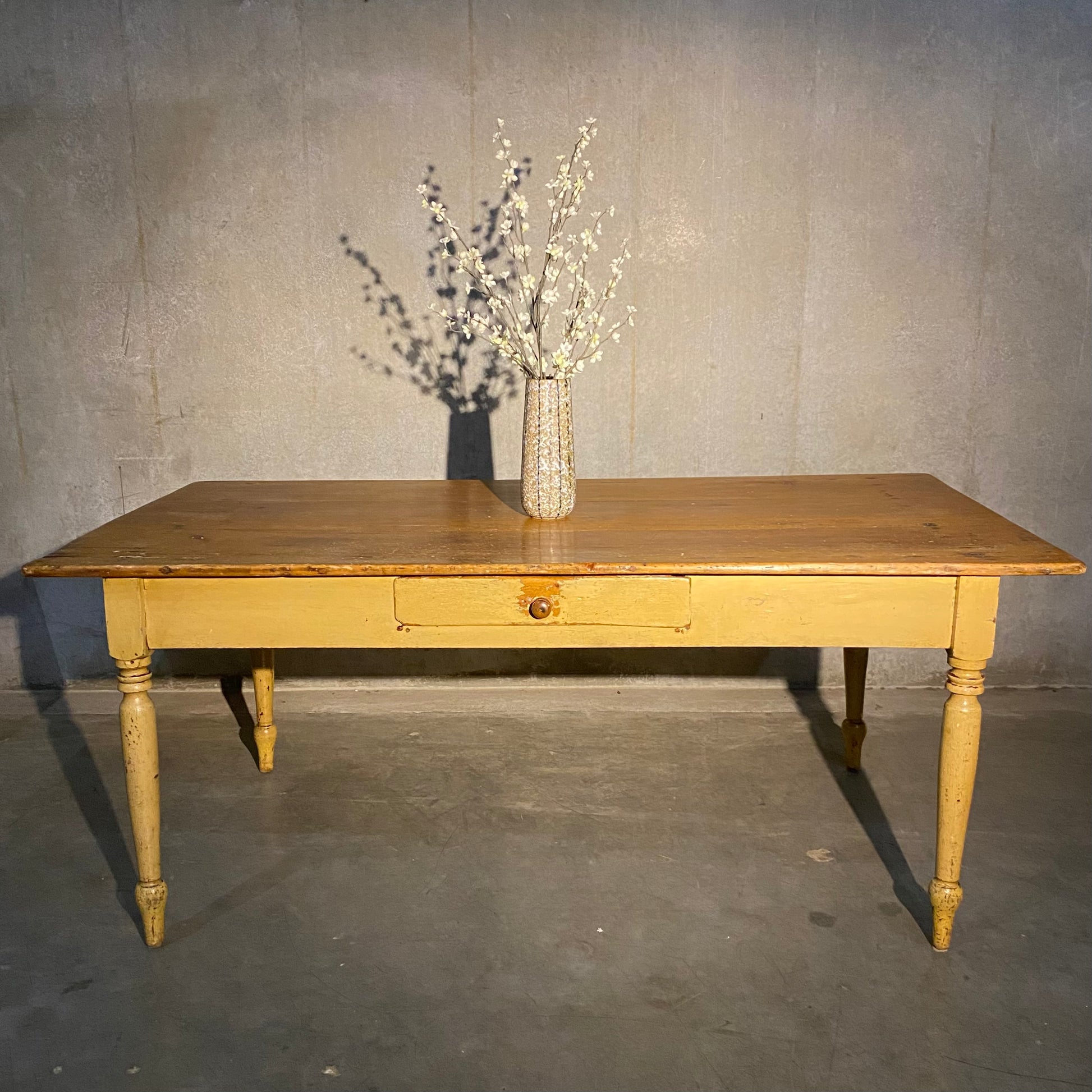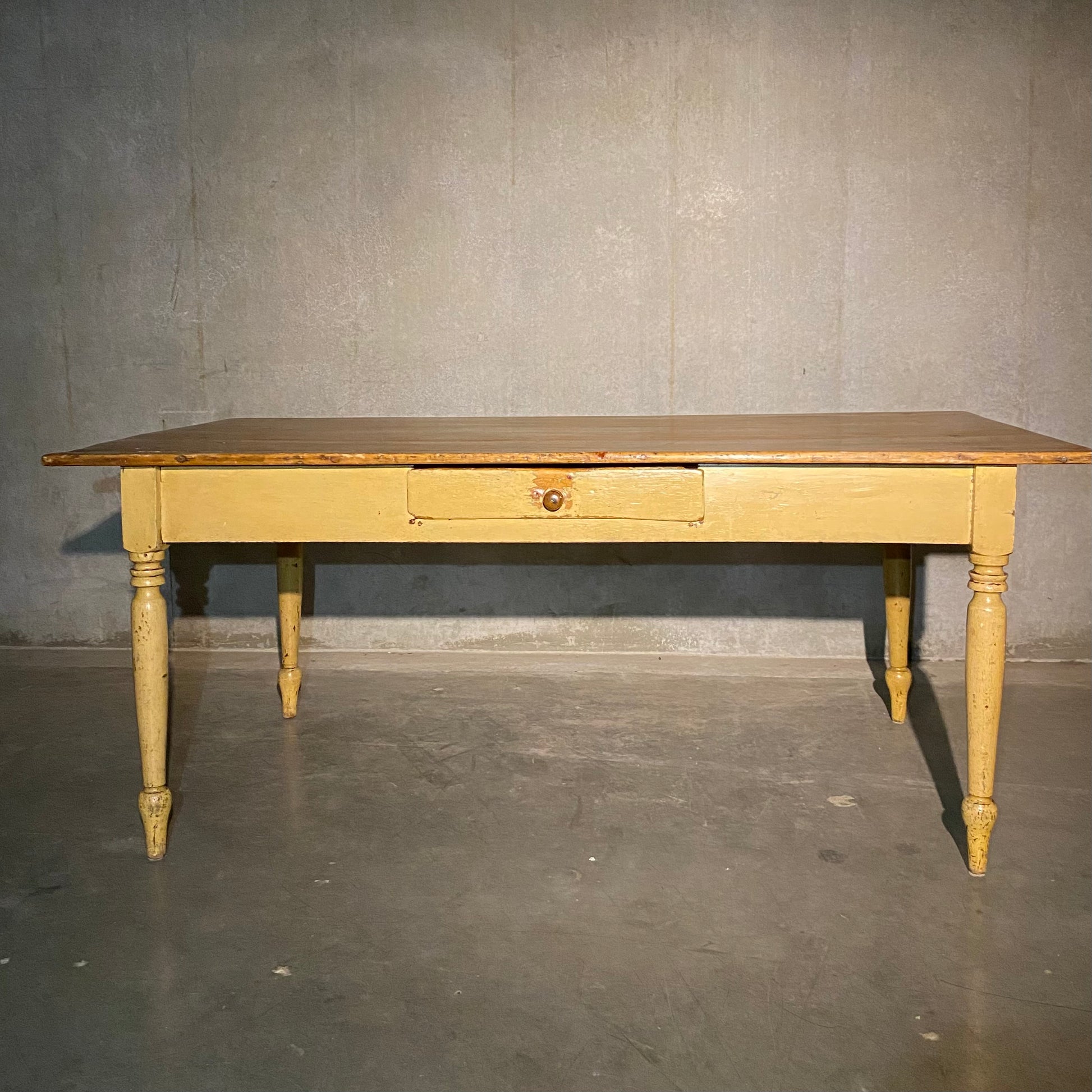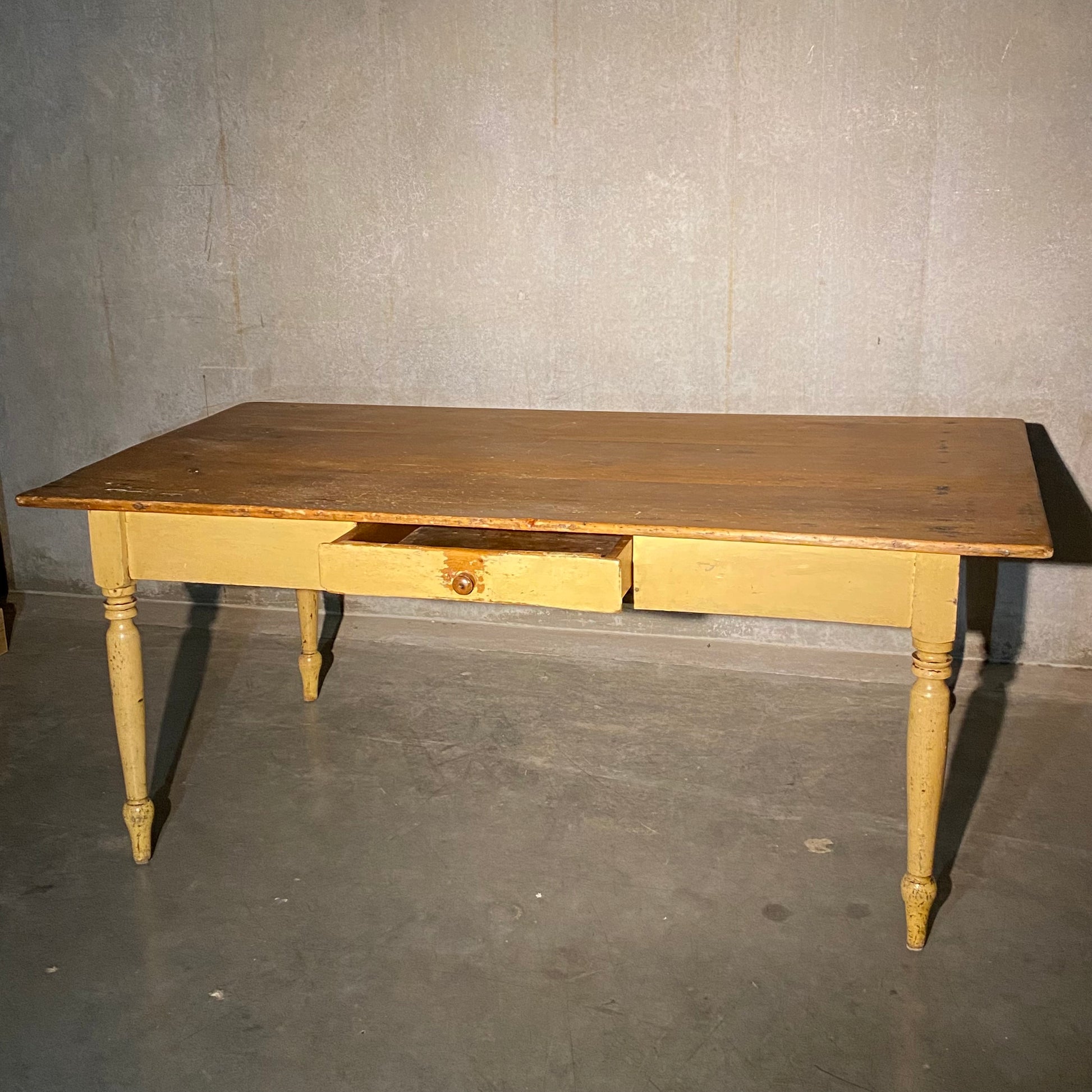 A beautiful original 19th c pine three board top, 6 footer with unusual wider top and drawer. Paint is old age cracked polychrome over original old red. A survivor from the 19th century . Lots of value here.