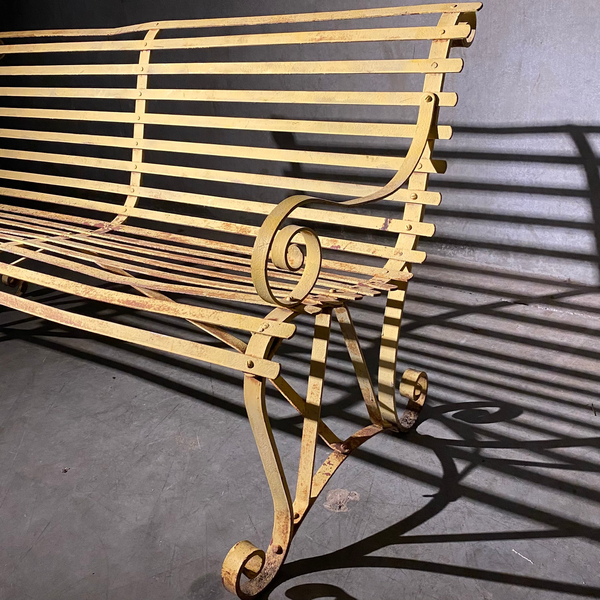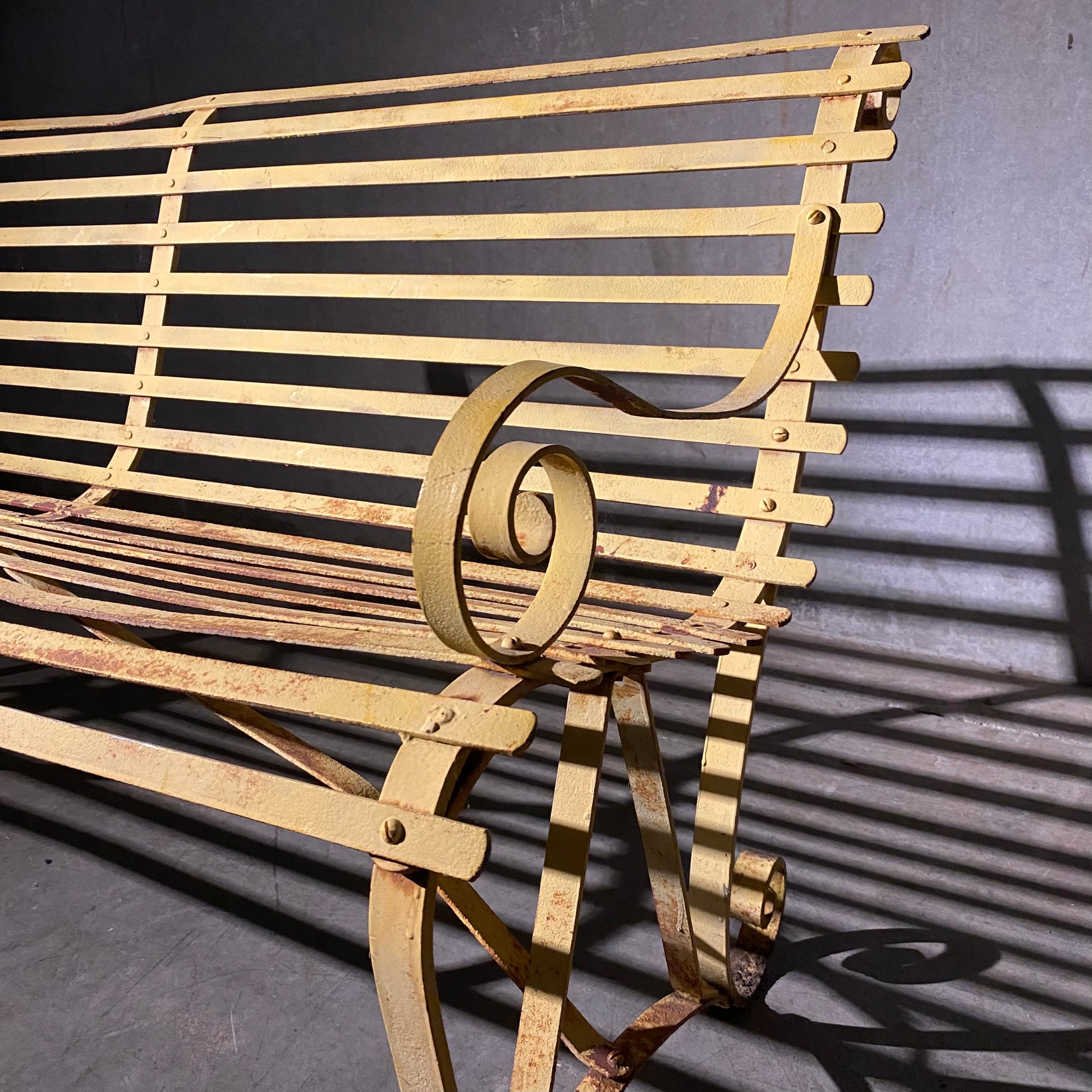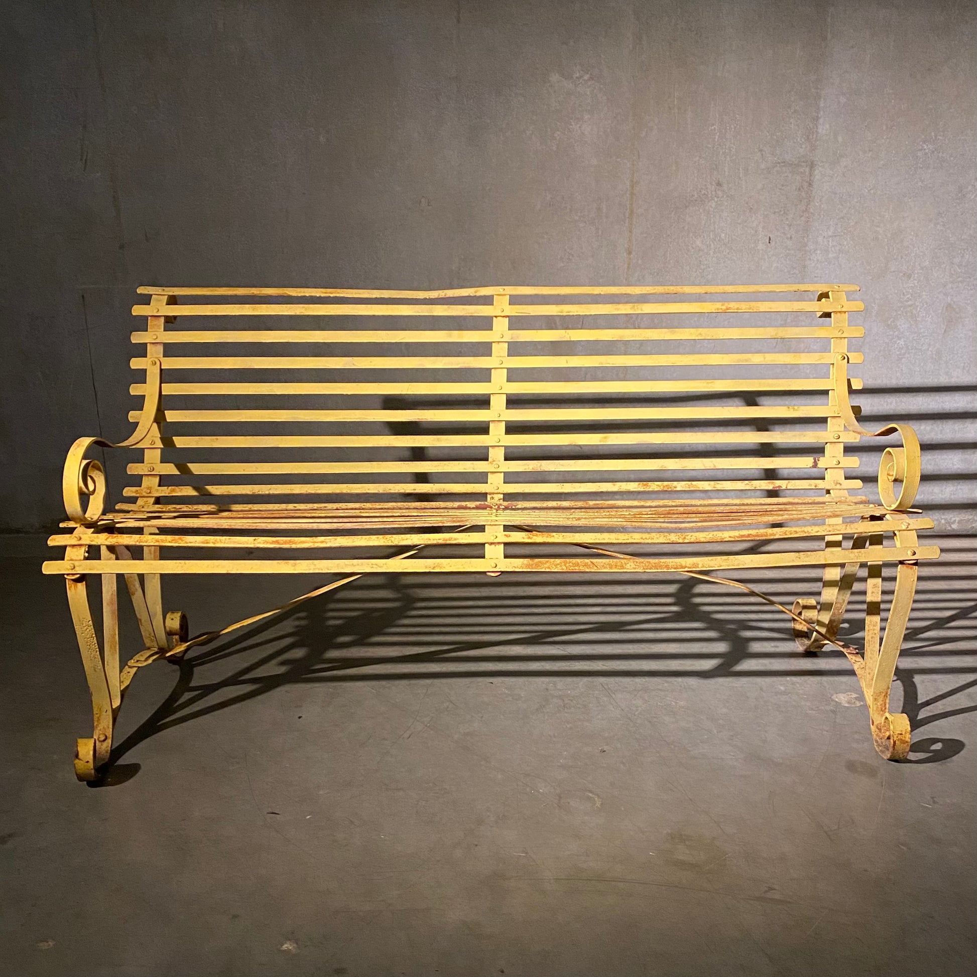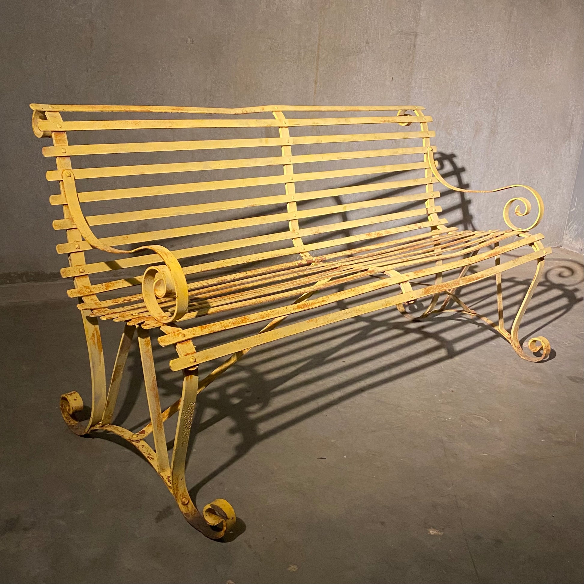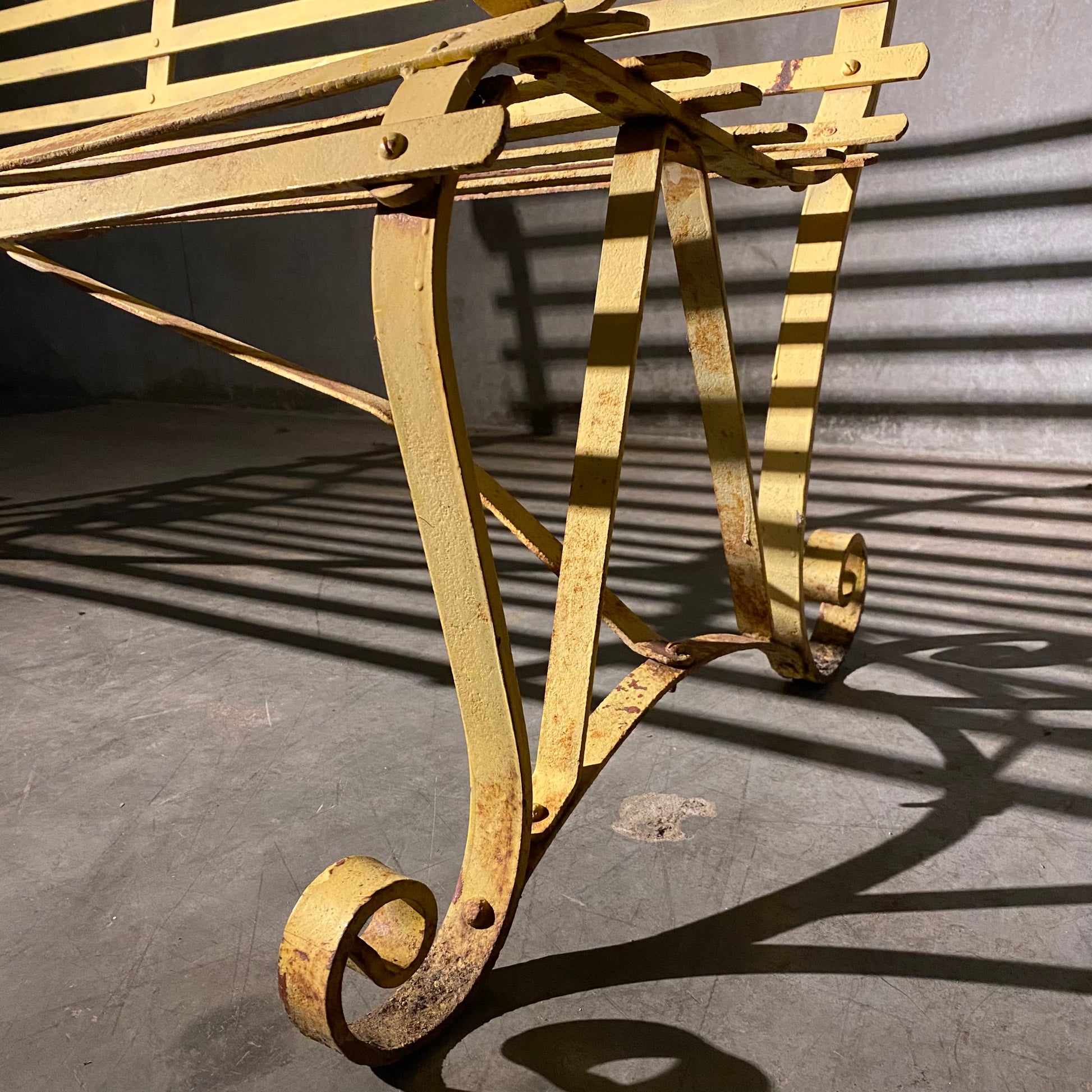Found in an estate in Montreal. Beautiful iron bench with old painted yellow finish . Beautiful patina solid and very well built .